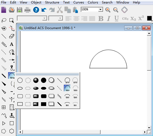 2.从“DrawingElements”工具箱中选择180度的圆弧,在ChemDraw绘制窗口单击拖拉生成合适大小的半圆弧,如下图所示: