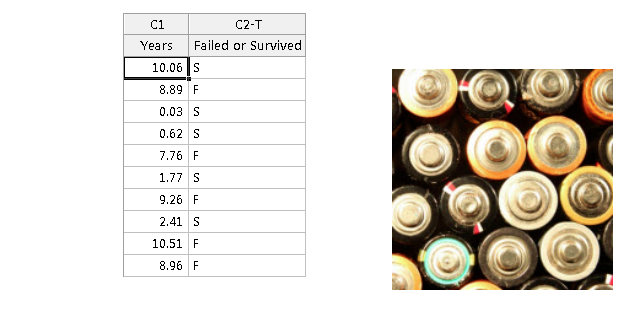 我们还知道“年份”一栏中的数字是准确的失效时间还是删失时间(电池在超过这个时间后保持存续)。我们必须将删失数据考虑在内。通过点击标记为“删失”的按钮,我们可以添加一个删失栏,其中包含指示起搏器在记录时间是存续还是失效的值。在我们的 Minitab 工作表中,“失效或存续”是删失栏。我们的删失值是“S”,代表“存续”,表明在起搏器电池跟踪期间没有观察到失效。