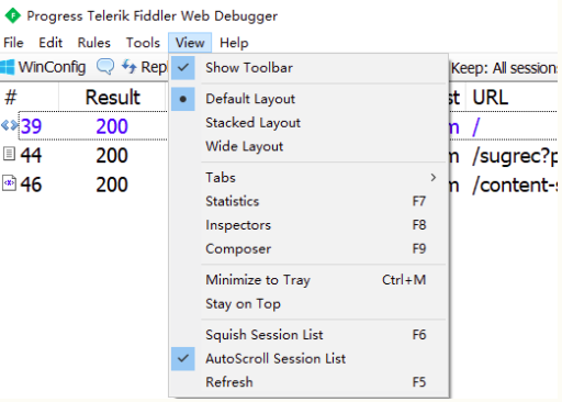 Default Layout:默认界面布局,session 在左,请求和响应在右边的上下处。