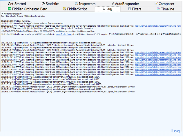 记录 Fiddler 的 log 日志,用来收集日志消息字符串,这些字符串是由扩展、 FiddlerScript 或者 Fiddler 本身生成的。Fiddler 会记录应用事件(如当保存或加载 SAZ 文件)以及系统事件(如系统的网络连接丢失或者恢复)的响应通知。