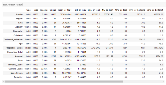 用于检测数据情况(EDA),方便我们对数据有一个总体的印象。输出每列特征的统计性特征和其他信息,主要的信息包括:缺失值、unique values、数值变量的平均值、离散型变量的众数等。如下面的cell,可以得到以下信息: