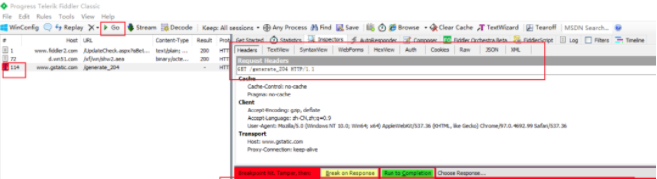 此时该请求上会有一个 “T” 字形的标记,这个就是进入了断点,我们点击这个请求。在右侧界面可以观察并修改这个请求的数据,包括请求头,请求url,请求体等。修改完成后按上方的 "GO" 按钮执行。然后在右下方就会展示响应信息,如果我们打了 "after Responses" 则会进入断点。