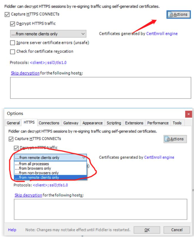 这个就是允许抓取 https 的流量。如果第一次使用,勾选之后会提示你安装一个证书,这个证书就是用来做中间人进行抓包的, Fiddler使用此证书来解密所捕捉到的包,再加密转发到相对应的服务器端或者客户端。