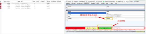 1、输入账号信息及验证码,提交前,进行断点设置,fiddler中选中Rules->Automatic Breakpoints->Before Requests;页面进行业务操作,此时在fiddler页面可以看见对应的请求图标会有个红色通行标示它表示请求过程中设置了断点,客户端发出的请求被fiddler拦截