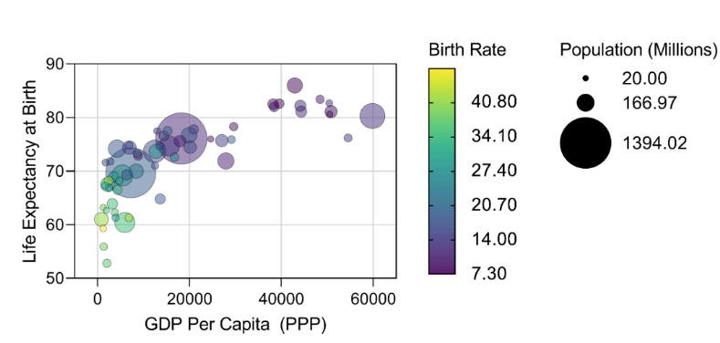 在此图上,有100多个国家/地区显示为单个圆圈。每个圆圈的X坐标代表该国的GDP(PPP),而Y坐标代表出生时的平均预期寿命。每个符号的大小与其所代表的国家的人口成比例(两个最大的符号分别代表中国和印度)。最后,每个符号的颜色代表该国家所在的大洲。在这个例子里的变量(颜色)是分类变量,但气泡图中的颜色也可以像下面这样由连续变量定义: