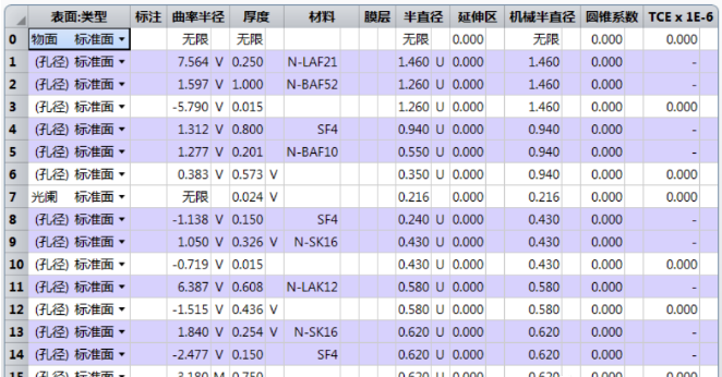 表3 f/2、视场40°的远心物镜,有效焦距1.0in,详细数据如下: